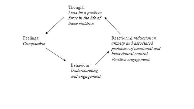 So, what was it about my initial intervention that achieved this positive outcome? Discussion with school authorities seemed to confirm that, in addition to the effects of providing direction to parents and school authorities about the care and management requirements of these children, there was a change in the perception of teaching and support staff regarding these children. Whereas the children I assessed had previously been viewed as in negative terms, I had provided evidence that the behavioural difficulties exhibited by the children stemmed from emotional difficulties, and there was a shift in perceptions of these children from bad to sad. The power of such a change in beliefs cannot be underestimated when one considers the impact of adult perceptions on the behaviour of children from the perspective of self-fulfilling prophecies, which I did. At the presentation I gave to school staff I put to those present a scenario similar to what follows (start at “thought“):