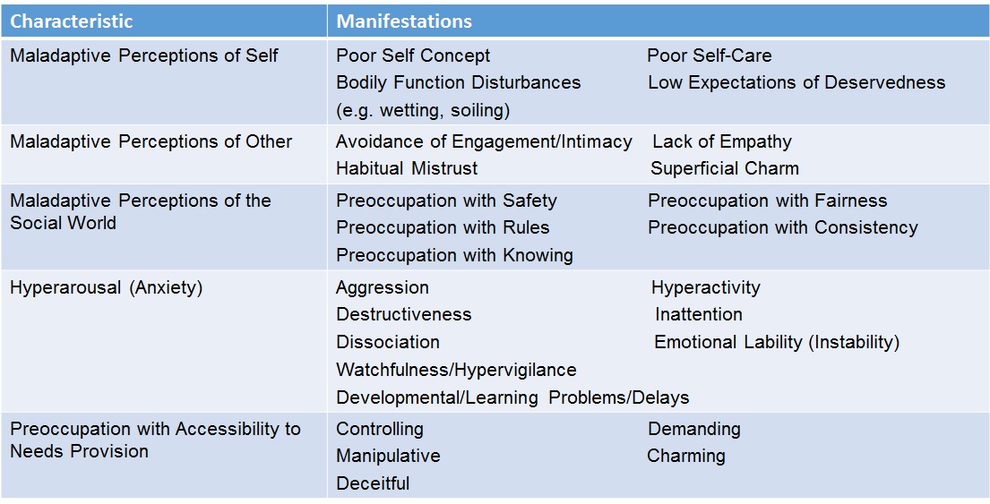 Participants in the survey were provided with a list of behaviours commonly observed among children in out-of-home care and have a history of early or developmental trauma (a.k.a. abuse and neglect), as presented under the heading “Manifestations” in the table below taken from Pearce, C. A Short Introduction to Attachment and Attachment Disorder. Jessica Kingsley, London. Participants were asked What behaviours do you typically see in the children in your care that cause you concern?
