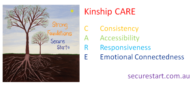 Kinship CARE encourages the implementation of a therapeutic care environment around the kinship child, in the pursuits of an optimal psychological environment and developmental outcomes within the kinship child. Kinship CARE incorporates the CARE1 (Consistency, Accessibility, Responsiveness, Emotional Connectedness) and Triple-A Models2. Drawn from psychological science, the CARE and Triple-A Models represent evidence-informed frameworks for understanding what good caregiving and psychological functioning looks like, and the impact of early adversity on the developing child. Kinship CARE applies thinking and caregiving strategies that support optimal developmental outcomes for children.