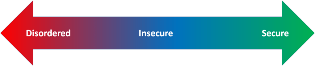 Although some of these attachments are more influential than others (typically referred to a primary attachments), our overall attachment style is influenced by our experience of relationships with all of the people towards whom we have developed an attachment. That is, if we think of attachment as a spectrum that ranges from disorder to security (see below), where each of us sits on the the spectrum is influenced to a greater or lesser degree by our collective attachment relationships.