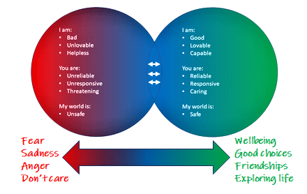 Among children and young people who have experienced early relational trauma, the attachment representations that influence their approach to life and relationships are predominantly negative. They believe themselves to be bad, unlovable, unworthy and incompetent; they believe adults in a caregiving role to be unresponsive, uncaring, and unsafe; and they believe that the world in which they live is a harsh and dangerous place. They approach life and relationships under the influence of these beliefs, and this is reflected in their behaviour. That is, their behaviour reflects their inner world and the beliefs they hold about themselves, others, and their world.