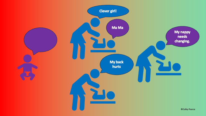In addition, in a conventional nurturing care environment parents can be observed to speak to their infant with ‘their voice’. That is, the parent says out loud what their infant is believed to be thinking or feeling, or what they need from the parent. If you are unsure of what I am talking about and have a pet, think about the way in which you speak to them. Through many such interactions, the infant begins to learn what words go with their experience and needs. When able to do so, the infant uses these words and, in conventional circumstances, is acknowledged with joy and pride at having done so, thus increasing the likelihood that they will use their words again.